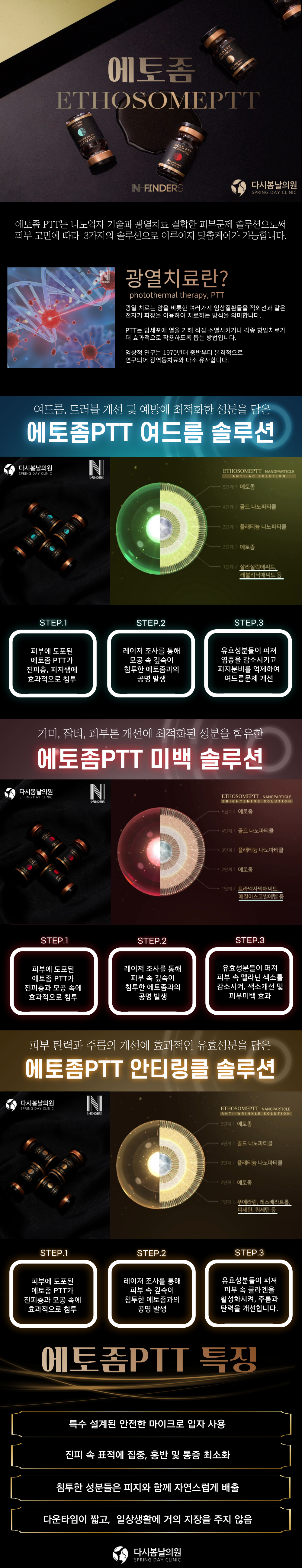 1기존 에토좀PTT와 달리 계면활성제 없이 친화 성분들로 예민하고, 민감한 피부에도 부담없이 시술 받으실 수 있는 장점과 골드 입자를 코팅하여 높은 피부 침투력으로 치료 효과를 높이며 3가지 앰플을 통해 여드름,주름,미백등 피부 문제에 따라 선택할 수 있어 전반적인 피부 고민을 개선할 수 있는 장점이 있습니다.