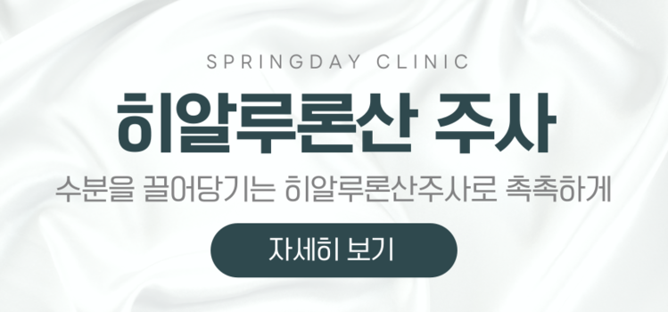 장점 히알루론산을 피부 진피층에 직접 주사함으로서 피부에 보습작용에 효과적입니다. 먹거나 바르는 히알루론산에 비해 직접적으로 보습효과를 나타내어 피부가 푸석거리고 건조한 증상을 막고 탄력을 유지시켜줍니다. 친수성인 히알루론산이 수분 유지 능력을 향상시켜 수분이 유지되어 촉촉한 피부와 탄력있는 피부를 만들어 줍니다. |